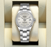 Chất liệu: Vỏ Oystersteel và vàng trắng 18K, gờ vàng trắng 18K với 46 viên kim cương. Mặt số bạc, giờ 10 viên kim cương.