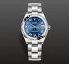Chất liệu: Vỏ Oystersteel và vàng trắng 18K, gờ vàng trắng 18K với 24 viên kim cương. Mặt số xanh, chữ số La Mã.