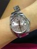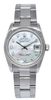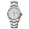 Chất liệu: Vỏ Oystersteel và vàng trắng 18K, gờ rãnh vàng trắng 18K. Mặt số trắng khảm ngọc trai, vạch giờ 10 viên kim cương.