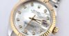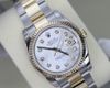 Chất liệu: Vỏ Rolesor Oystersteel và vàng 18K, gờ có rãnh vàng 18K. Mặt số ngọc trai, vạch giờ 10 viên kim cương.