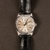 Chất liệu: Vỏ vàng trắng 18K, bộ gờ rãnh vàng trắng 18K. Mặt số bạc, vạch chỉ giờ.